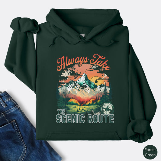 Always Take the Scenic Route Hoodie – Mountain Adventure Graphic Pullover